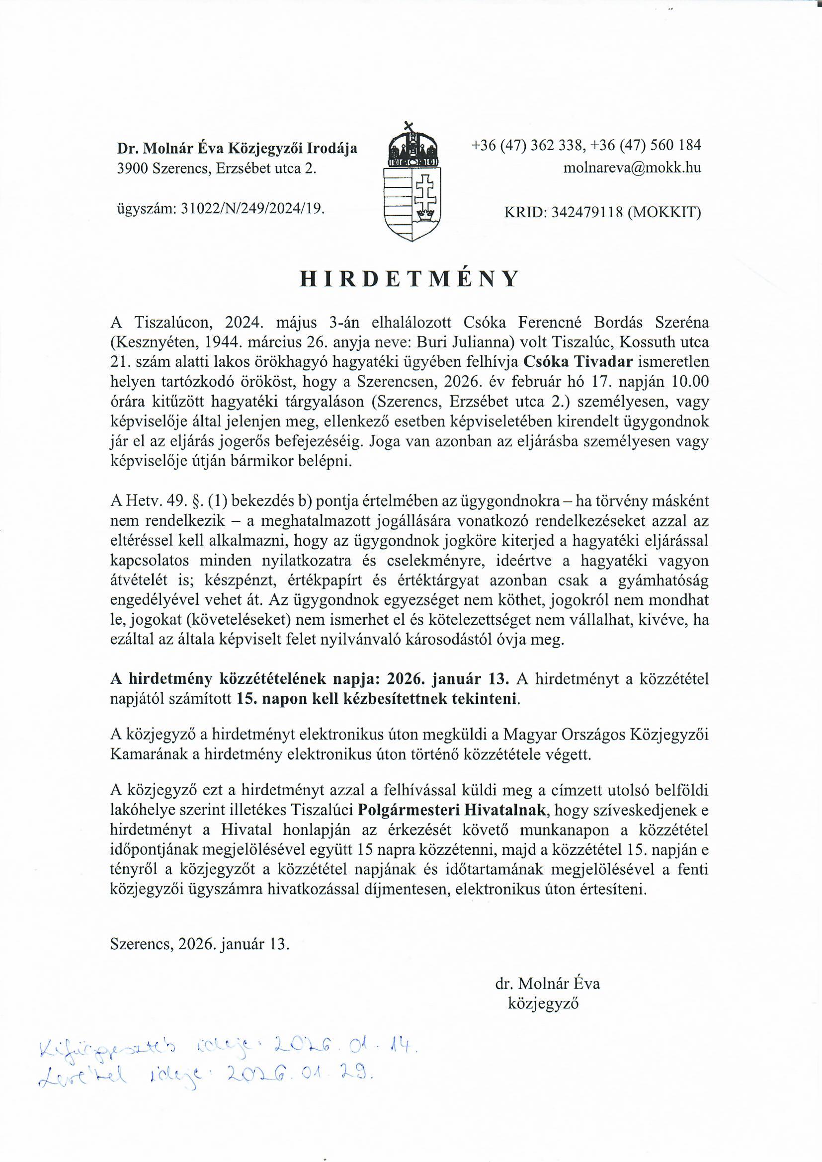 Hirdetmény - Csóka Tivadar