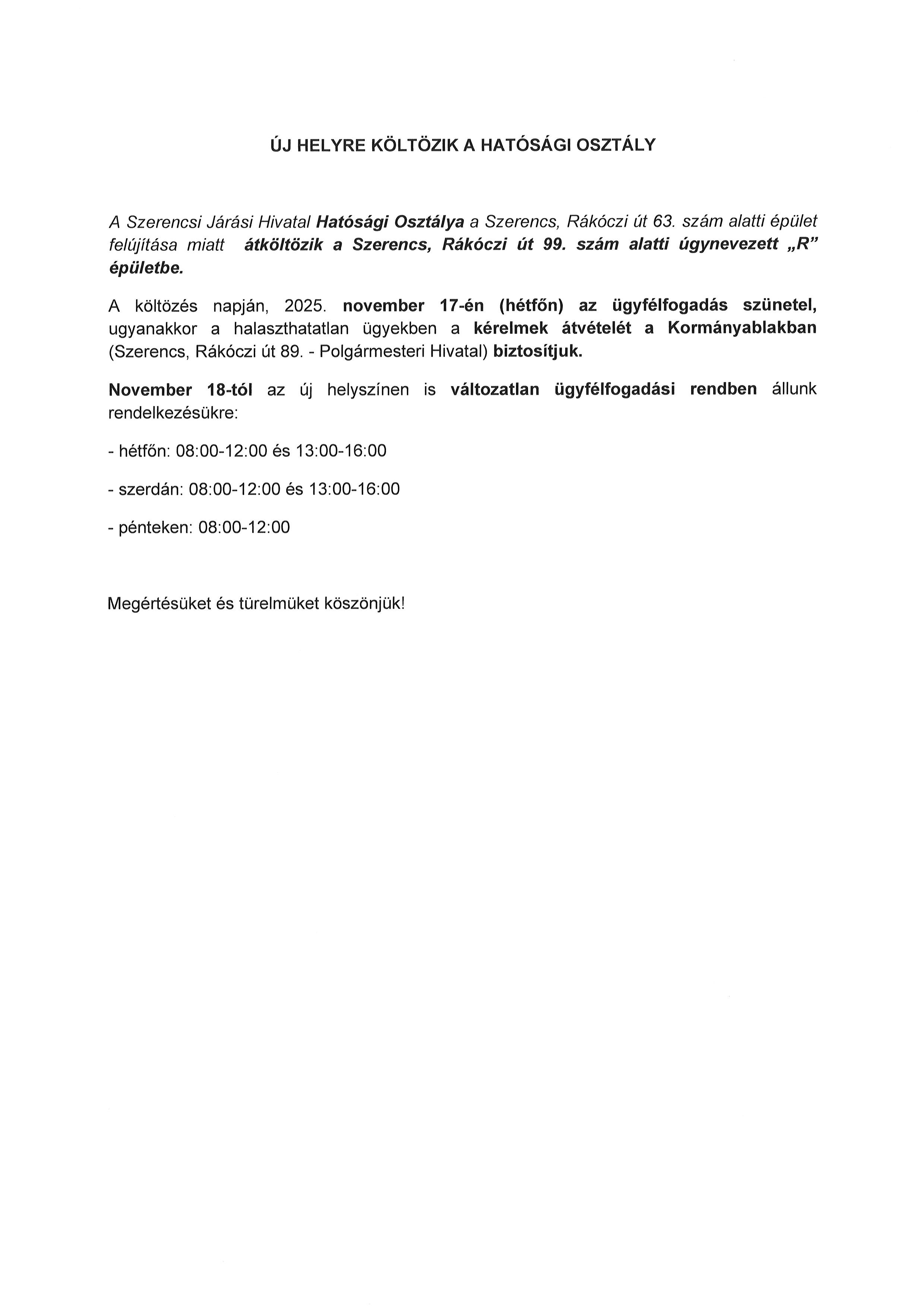 Csatolmány(ok): Szerencsi Járási Hivatal Hatósági Osztálya felújítás miatt átköltözik!299.88 KB Szerencsi Járási Hivatal Hatósági Osztálya felújítás miatt átköltözik!
